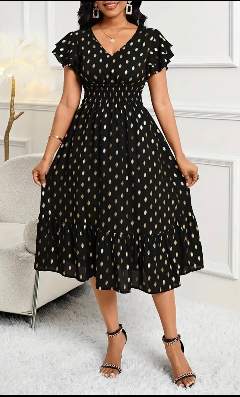 Destaque-se com este vestido midi preto com estampa dourada. Ideal para festas, jantares ou ocasiões especiais. Modelagem que valoriza o corpo e tecido confortável.